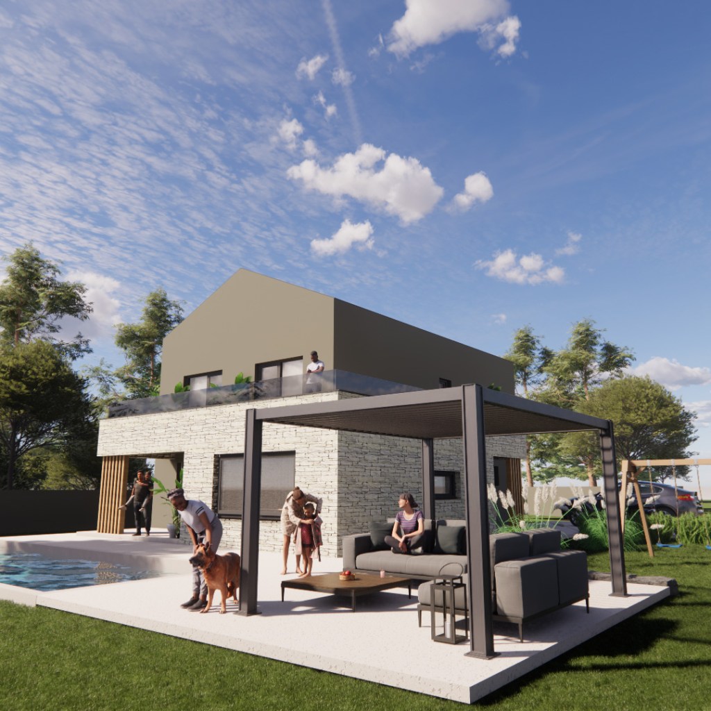 Predstavljam prekrasnu kuću “Vella” – dom oblikovan u modernom stilu s dozom mediteranskog šarma. Ova prostrana kuća idealna je za cijelu obitelj, a inspiraciju crpi iz izgleda stare istarske kuće s neodoljivim “baladurom”. Poseban naglasak stavljen je na spoj estetike i funkcionalnosti – prizemlje je osmišljeno tako da nudi dovoljno prostora za ugodan život i za osobe s invaliditetom.
